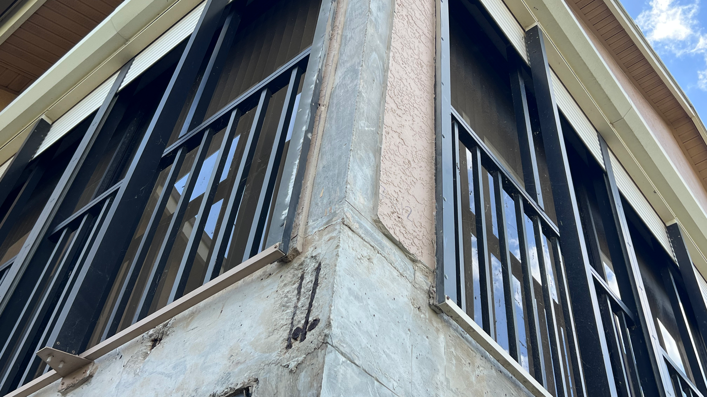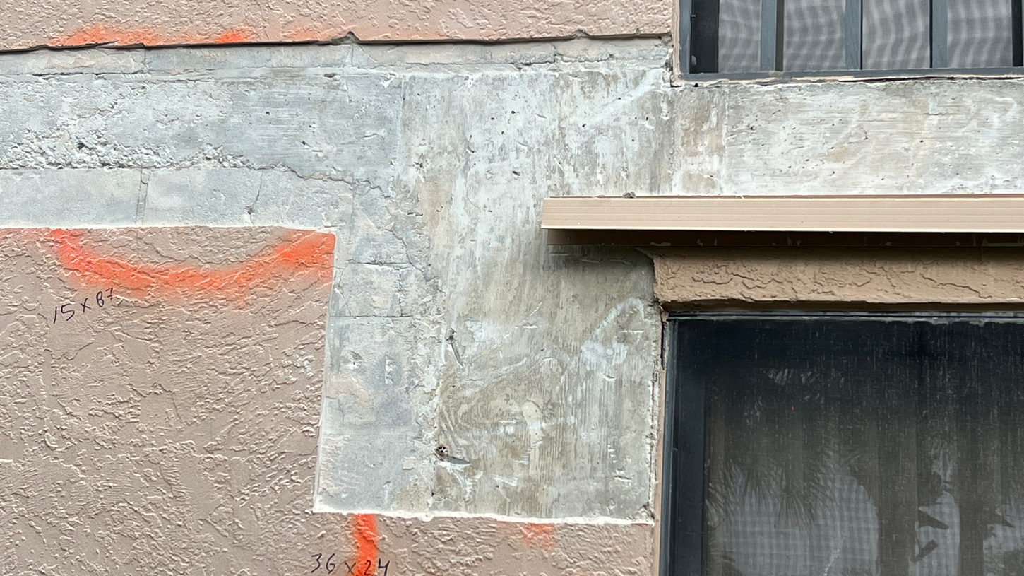 During our initial site evaluation, our team identified several underlying building envelope concerns, including widespread stucco delamination, spalled concrete, and a decorative wood banding element that was in significant disrepair and required repair or replacement prior to recoating.